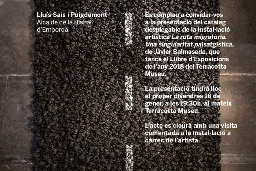 Es complau a convidar-vos a la presentació del catàleg desplegable de la instal·lació artística La ruta migratòria, Una singularitat paisatgística, de Javier Balmaseda, que tanca el Llibre d'Exposicions 2018 del Terracotta Museu.