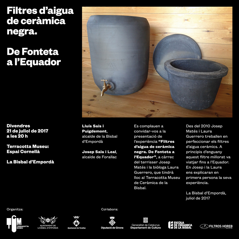 Aquest divendres 21 de juliol a les 20h, el Terracotta Museu presentarà l'experiència "Filtres d'aigua de ceràmica negra. De Fonteta a l'Equador", un acte a càrrec del terrisser Josep Matés i la doctora en biologia Laura Guerrero. La presentació tindrà lloc a l'Espai Cornellà i estarà presidida pels alcaldes de la Bisbal d'Empordà i Forallac, Lluís Sais i Puigdemont i Josep Sala i Leal, respectivament.