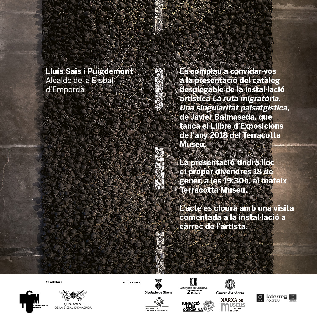 Es complau a convidar-vos a la presentació del catàleg desplegable de la instal·lació artística La ruta migratòria, Una singularitat paisatgística, de Javier Balmaseda, que tanca el Llibre d'Exposicions 2018 del Terracotta Museu.