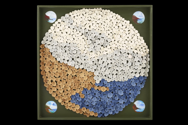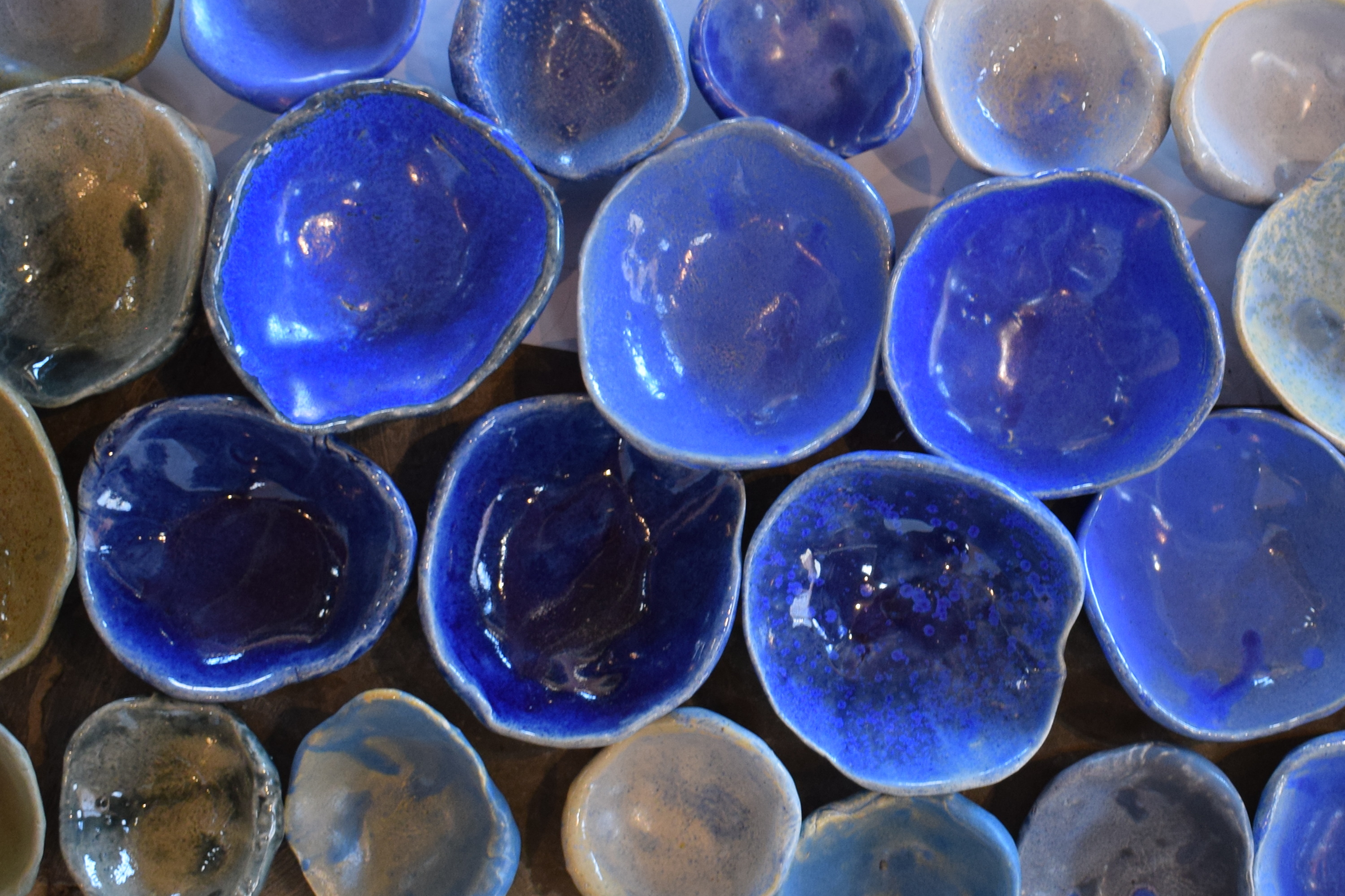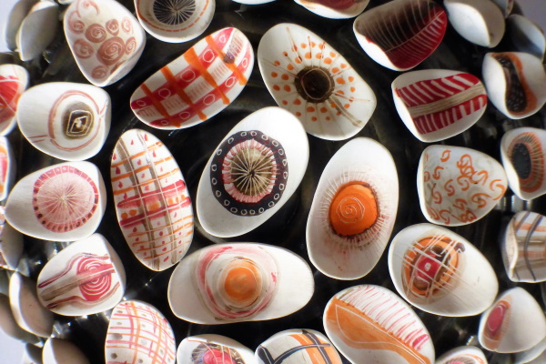 Fondo marino: esmaltes con la paleta de colores de Rogenca, realizado con la huella de los codos y rodillas de la artista.